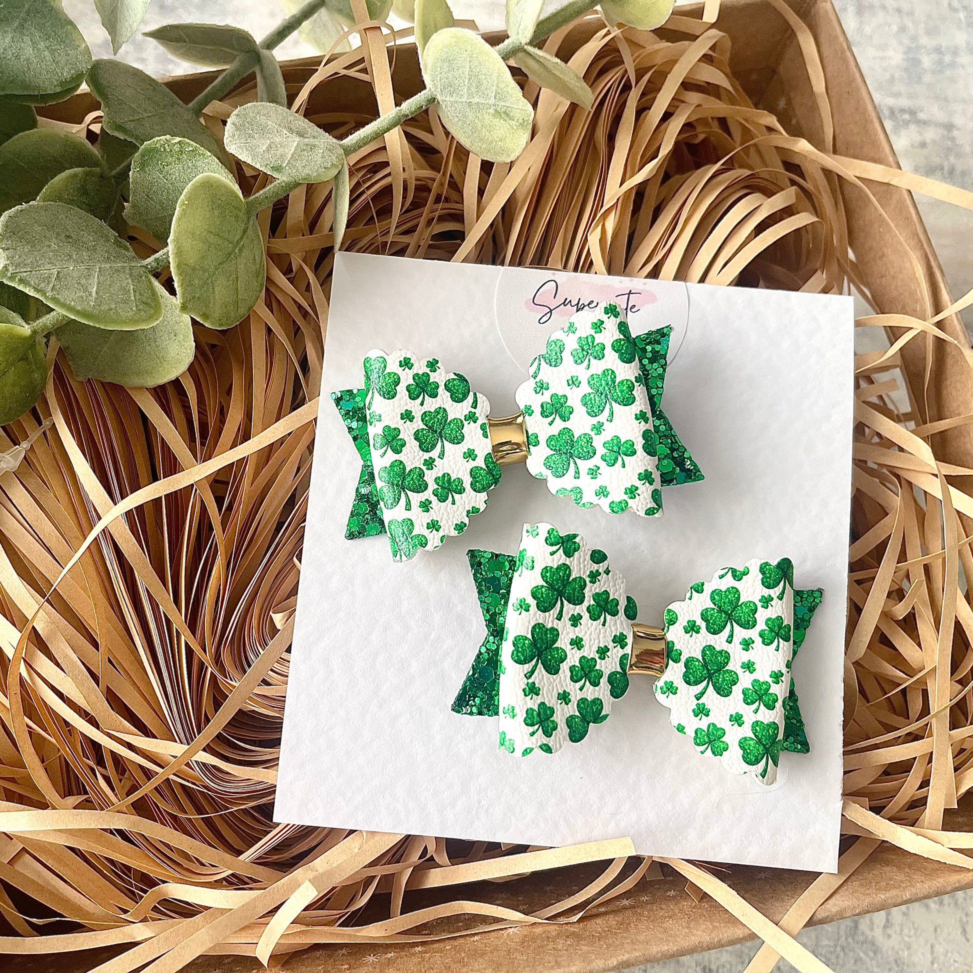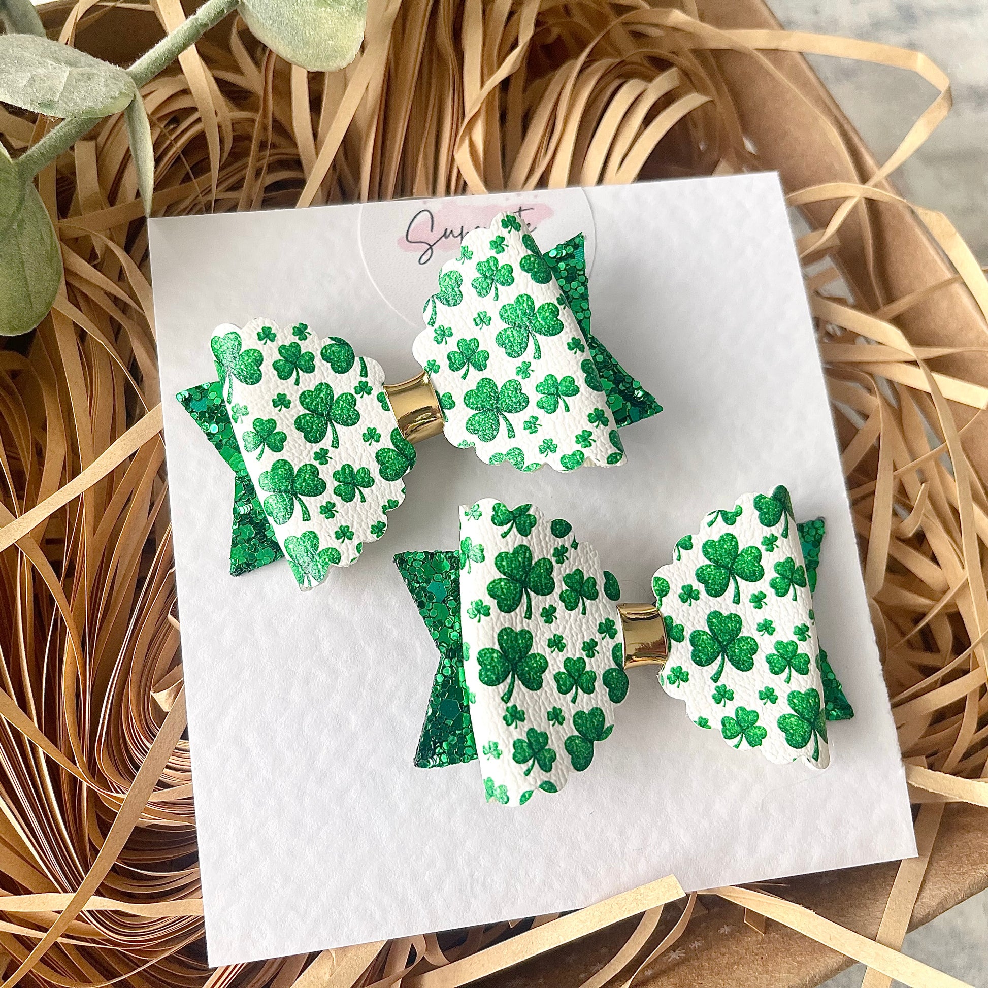 A pair of our fab piggy bows in a gorgeous clover print faux leather, teamed with emerald green glitter tails.