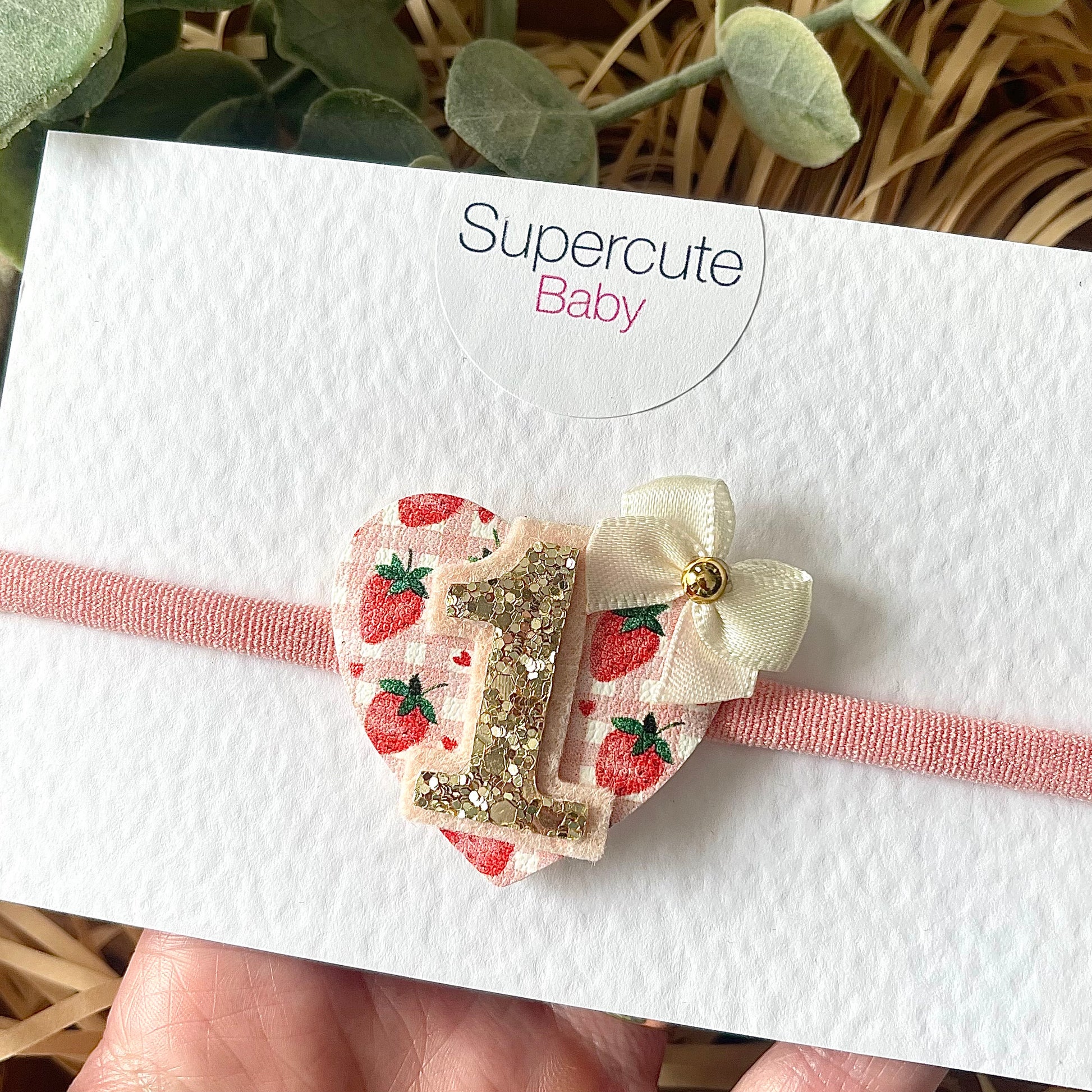 A special band for a very special day. This gorgeous baby headband features a strawberry print faux leather, a luxury gold glitter number 1 and is finished with a dinky satin bow & pearl.
